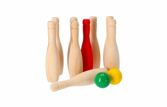 Bowling set outdoor hout. Deze houten bowling set bevat 9 kegels, 2 ballen en een opbergnet. Geschikt voor kinderen vanaf 5 jaar oud.