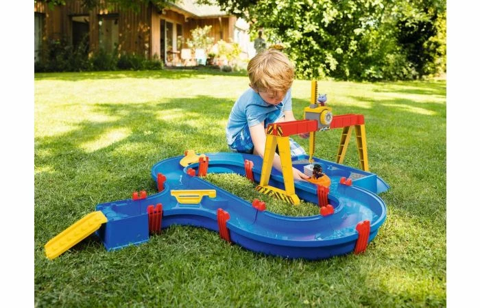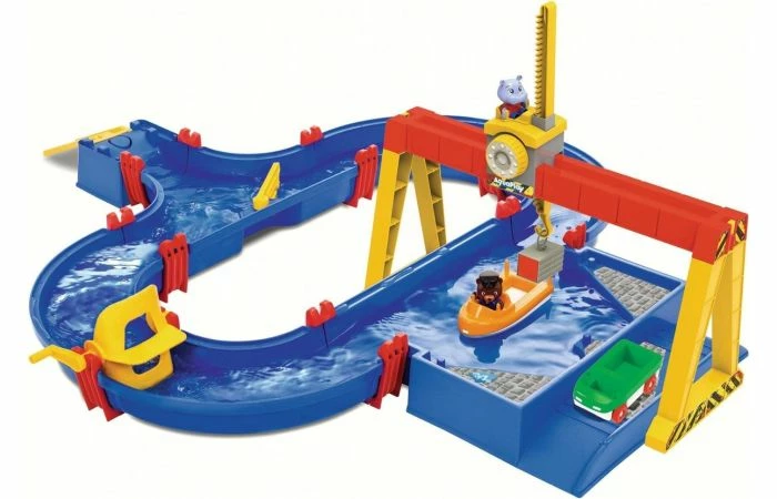 De grote AquaPlay ContainerPort set bevat een kanaalsysteem met bakboord en toegangshelling, een grote portaalkraan, een slinger om stroom op te wekken, een containerboot met containers, een amfibievoertuig en de twee speelfiguren Bo de beer en Wilma het nijlpaard . Samen met hun twee vrienden kunnen kinderen spelenderwijs over water leren, ontdekken hoe stromingen ontstaan, waardoor water van richting verandert en hoe boten drijven. De set leert hen ook hoe ze eenvoudige processen kunnen coördineren, zoals het laden en lossen van containers en het handmatig omhoog en omlaag brengen van