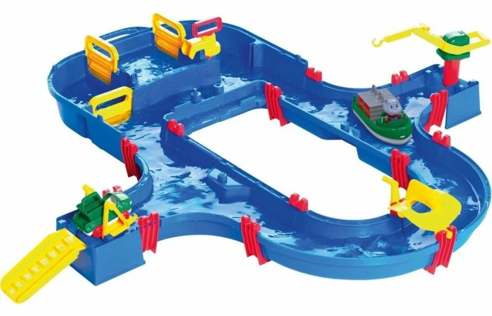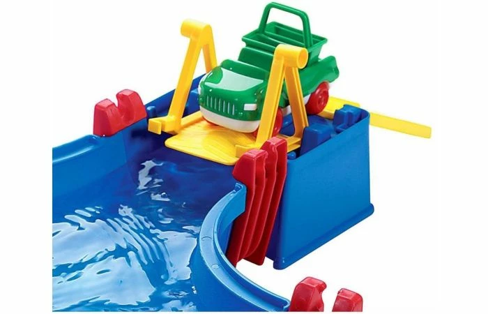 Een bijzonder hoogtepunt voor de kinderen is het stuwmeer met sluis. Wanneer de poorten gesloten zijn, wordt met de handpomp water in het zwembad gepompt. Hierdoor beweegt de boot omhoog en kan deze door de sluis. Iets verder weg is een havenbassin met een kraan waarmee schepen kunnen worden geladen en gelost. En de reis gaat verder langs de brede waterweg naar de aanlegsteiger. Hier kunnen boten aanleggen of het amfibievoertuig kan de waterwereld in.