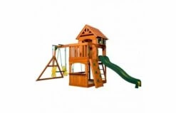 De Atlantic houten schommel zit boordevol functies, maar past nog steeds in kleinere tuinen. Het heeft een geweldig clubhuis boven met erkers en een veranda. Beneden is er