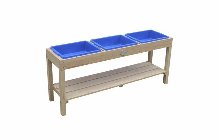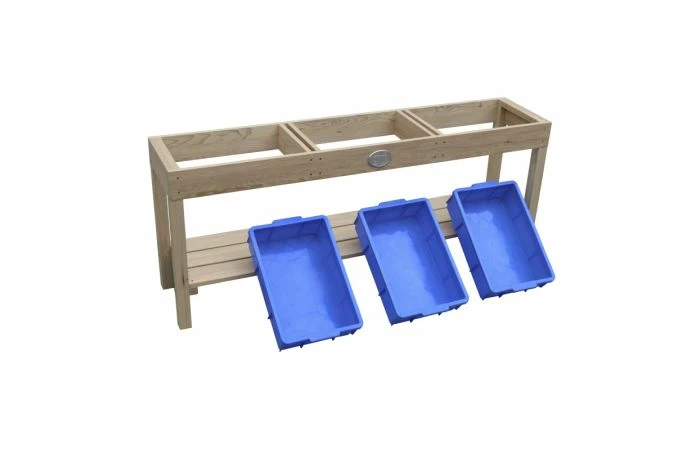 - Drie uitneembare blauwe kunststofbakken voor zand of water.