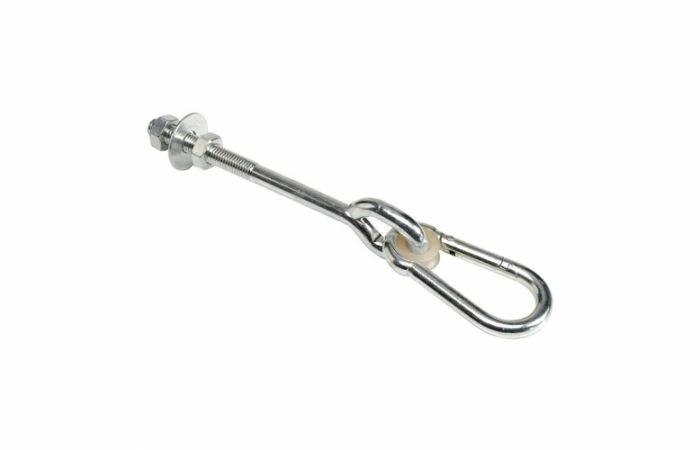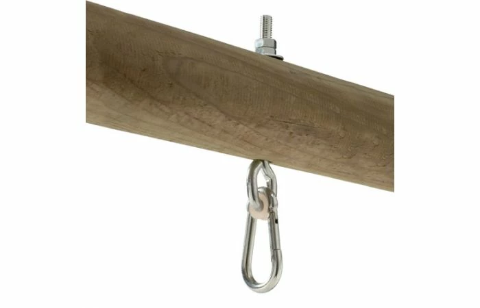 Robuuste schommelhaak van gegalvaniseerd staal met weerbestendige coating en veiligheidssluiting. De karabijnhaak is voorzien van een nylon lager die veel duurzamer is dan een lager uit PP.