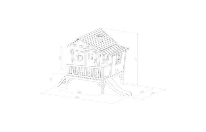 Speelhuis Emma heeft een platformhoogte van 58 cm en een totale hoogte van 227 cm. Het speelhuis is 193 cm lang en 349 cm breed. Vanwege het schuine ontwerp heeft dit speelhuis een afwijkende binnenmaat. Zo is de vloerbreedte 175 cm, maximale breedte 205 cm en de lengte 115 cm. Met een nokhoogte van ca. 165 cm is Emma een groot houten speelhuis.