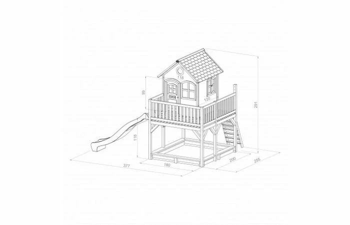 Via de trap kunnen ze omhoog klimmen om het huisje in te gaan en vervolgens van de lange glijbaan naar beneden roetsjen. En dan zijn ze nog niet uitgespeeld, want onder het speelhuis is ook nog een zandbak waar ze met z’n allen zandtaartjes kunt bakken. In dit speelhuis kunnen ze elkaar de mooiste geheimen vertellen. Zodra ze de ramen en deur dicht doen, kan niemand ze meer afluisteren! Liam is een veelzijdig houten speelhuis met een halfronde deur en ramen. De deur heeft een brievenbus waar kinderen post doorheen kunnen gooien als ze postbodetje spelen. Het speelhuisje is uitgevoerd in moderne bruin/witte kleuren welke perfect in iedere hedendaagse tuin passen. Liam speelhuis heeft een platformhoogte van 118 cm en is uitgevoerd met een grote glijbaan van 228 cm lang. Als de kinderen zijn uitgespeeld kan de zandbak eenvoudig worden afgedekt met de meegeleverde afdekhoes.