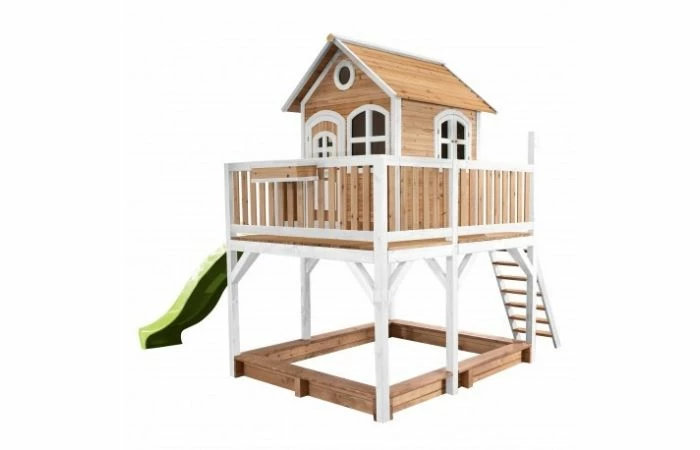 Liam Speelhuis Bruin/wit van AXI geeft je kinderen oneindig veel speelplezier! Het is onmogelijk dat kinderen zich hier niet uren mee zullen vermaken op een mooie zonnige dag. De grote veranda maakt het allemaal nog unieker. Daarmee kunnen de kinderen turen over de omgeving en kunnen ze vriendjes en vriendinnetjes van veraf aan zien komen.