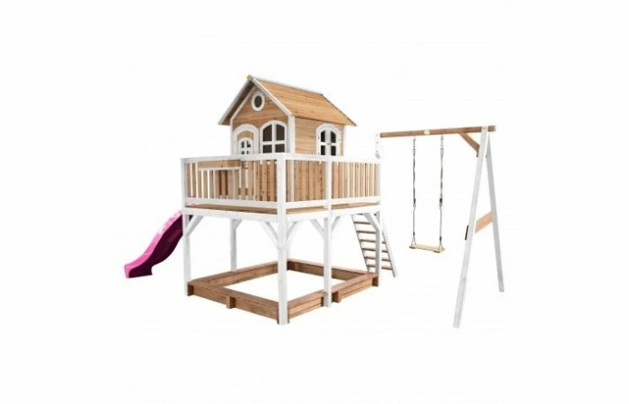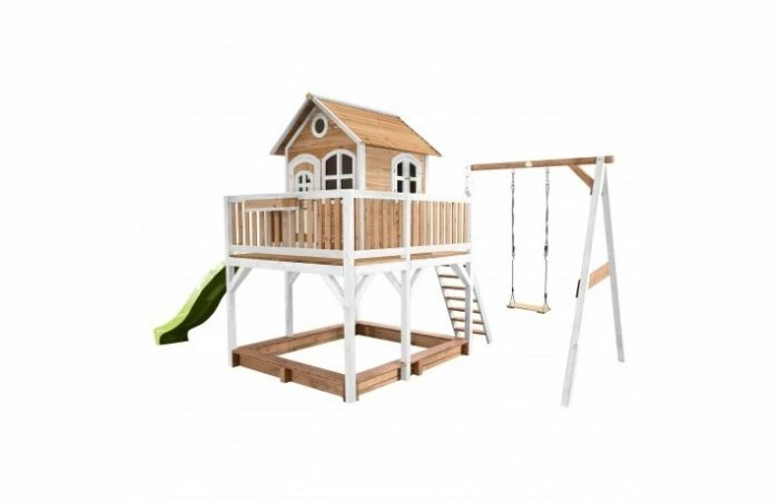 Liam Speelhuis met Enkele Schommel Bruin/wit van AXI geeft je kinderen oneindig veel speelplezier! Klimmen, glijden en schommelen zijn de favoriete bezigheden van jonge kinderen. En dat is nou juist allemaal mogelijk met Liam. Het is onmogelijk dat kinderen zich hier niet uren mee zullen vermaken op een mooie zonnige dag. De grote veranda maakt het allemaal nog unieker. Daarmee kunnen de kinderen turen over de omgeving en kunnen ze vriendjes en vriendinnetjes van veraf aan zien komen. Naast het uitzicht vanaf de veranda kunnen ze heerlijk genieten van hun vrijheid als ze aan het schommelen zijn.
