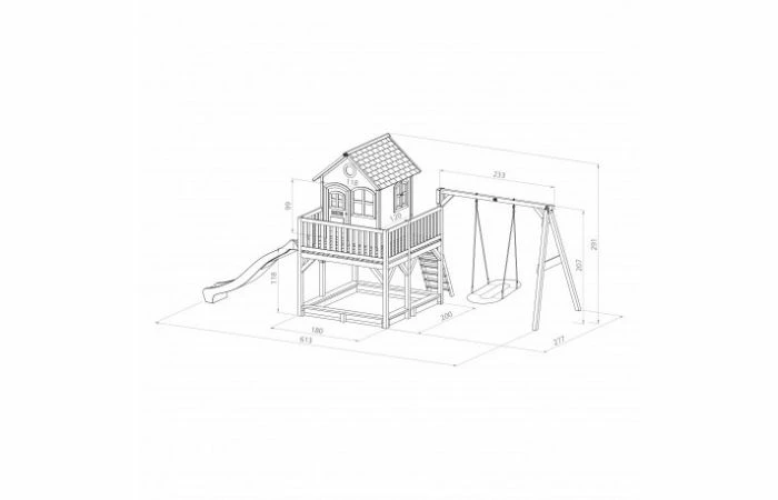 Speelhuis Liam heeft een platformhoogte van 118 cm en een totale hoogte van 291 cm. Het speelhuis is 277 cm lang en 613 cm breed. Met een binnenmaat van 115 x 113 cm en een nokhoogte van ca. 166 cm is Liam een middelgroot houten speelhuis.