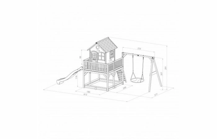 Speelhuis Liam heeft een platformhoogte van 118 cm en een totale hoogte van 291 cm. Het speelhuis is 277 cm lang en 613 cm breed. Met een binnenmaat van 115 x 113 cm en een nokhoogte van ca. 166 cm is Liam een middelgroot houten speelhuis.