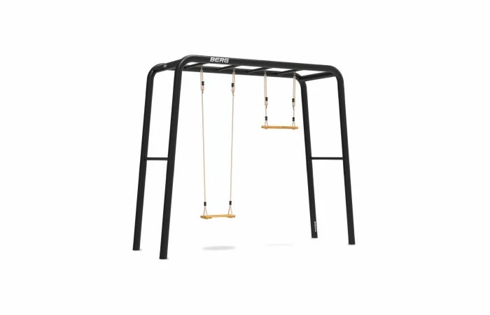 De basis voor dit concept is het sterke, robuuste frame. Deze heeft een modern en minimalistisch design en beschikt over een gepatenteerde buisverbinding. Het geheel staat stevig in de grond en vormt zo een solide basis voor allerlei toepassingen. Kies zelf of je voor de Large variant van 380 cm breed gaat of voor de Medium variant van 285 cm breed. De diepte en de hoogte van beide frames zijn gelijk. Namelijk 100 cm. diep en 245 cm. hoog. Voor de zijkanten van het frame kan je kiezen uit een trap of duikelrek of een combinatie van deze twee.