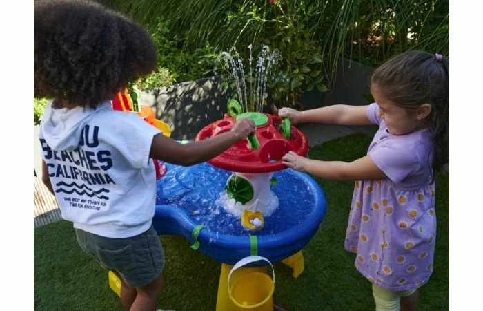 De AquaPlay watertafel is compatibel met Gardena-aansluiting voor het vullen en heeft een plug voor eenvoudig legen. De tafel is zeer stabiel en gemakkelijk te verplaatsen, wat het handig maakt voor kinderen om te spelen waar ze maar willen. In de tuin of op het terras, alles is mogelijk. De tafel in leuk ontwerp heeft een paddenstoel met een waterval- en splashfunctie. Er is ook een pompsysteem met groot handvat. De watertafel wordt geleverd met wat extra accessoires zoals gieter, emmer en pollepel, 2 zeilboten en 2 figgurtjes. Bijgeleverde clips kunnen eenvoudig aan het bord van de tafel worden gehaakt om de accessoires op te hangen.