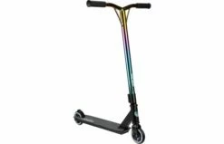 Rijd als een baas op jouw Black Dragon Neo Chromagnon stuntstep! Deze limited edition Black Dragon stuntstep heeft een extra sterk rechthoekig aluminium en heavy-duty stalen frame met een triple stuurstang klem. Speciaal gemaakt om trucjes mee te doen dus. De luxe neochrome aluminium gespaakte wielkern wordt gecombineerd met harde 85A wielen en ABEC 9 carbon lagers. Dit maakt het stepje tot een snelle, stevige en super wendbare stuntstep die de impact van stuntstep tricks (leren) makkelijk aankan! Je hebt een goede grip op de weg of skatebaan en de wielen draaien extra soepel. De comfortabele rubberen handvatten hebben extra stootbescherming aan de uiteinden en op het achterwiel zit een stalen flex voetrem. Als laatste heeft de step een prachtige luxe neochrome design met een hippe uitstraling, je steelt gegarandeerd de show met deze vette stuntstep. De maximale belasting is 100 kg en de step komt met 2 inbussleutels voor de stuurklem.