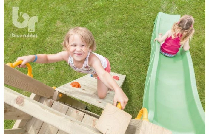 De @wall module is eenvoudig te installeren en past op alle speeltorens van het Blue Rabbit 2.0 assortiment. Met eenzelfde bouwpakket en één van de bijhorende houtpakketten kunnen de twee varianten worden gebouwd zodat deze module past op torens met een platformhoogte van 1,5 m.