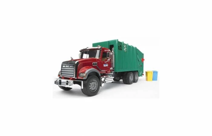 De vuilniswagen is voorzien van een vuilnisopbouw, waarvan de achterzijde gekanteld kan worden, zodat het geladen afval ook weer gestort kan worden. De (meegeleverde) vuilnisbakken (2x) kunnen via draaiknop worden geleegd in de bak. (deze vuilniswagen kan ook de grote grijze container legen). De deuren van de cabine kunnen open, zodat ook Bruder figuren gebruikt kunnen worden.
