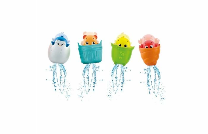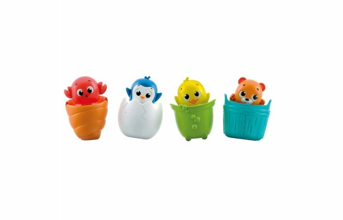 Clementoni peek-a-boo badspeeltjes. Vier lieve diertjes met kiekeboe functie: ontwikkeld om het gevoel en de handvaardigheid van kinderen te stimuleren en ze op vele verschillende manieren bezig te houden. Kinderen kunnen zelfstandig met de speeltjes experimenteren. De personages stimuleren de handvaardigheid en helpen kinderen de wereld te ontdekken via kleine acties die verrassende effecten hebben. Als de leuke wezentjes onder water duiken, komen ze snel weer bovendrijven: de krab gluurt uit zijn schaal, de pinguïn komt uit zijn ei en het eendje en de beer verschijnen weer boven water. Als het kind de speeltjes uit het water haalt, lopen ze leeg met een leuk fontein-effect, waarna de leuke beestjes zich weer in hun holletjes verstoppen. De speeltjes zijn gemakkelijk beet te pakken door de kleine handjes en ontelbare keren in het water worden gegooid: elke keer zullen ze weer uit hun holletjes komen. Geschikt voor kinderen vanaf 6 maanden.