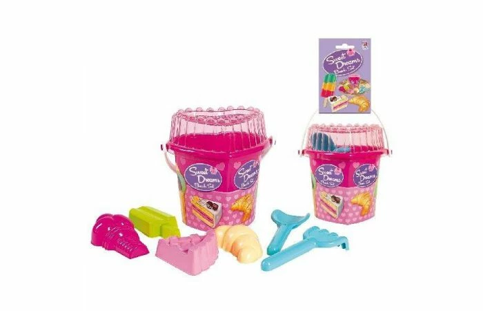 Maak de lekkerste snacks van zand! De set bestaat uit een kunststof emmertje, vormen voor een taartpunt, croissant en 2 ijsjes, een harkje en een schepje.