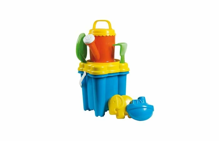 7-delige emmerset waarmee een prachtig kasteel te maken is, door de onderste grote emmer te vullen met zand. Accessoires: gieter, schep, zeef, harkje en 2 vormpjes.