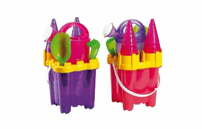 Kasteelemmerset met glitters. Deze 7–delige set bevat een emmer met zeefdeksel, een gieter, een schep en hark en twee vormpje.