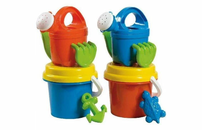 Emmersetje met gieter, harkje, schepje, zandvormpje, vergiet en emmertje met diameter van 11 cm. 2 assorti kleuren.