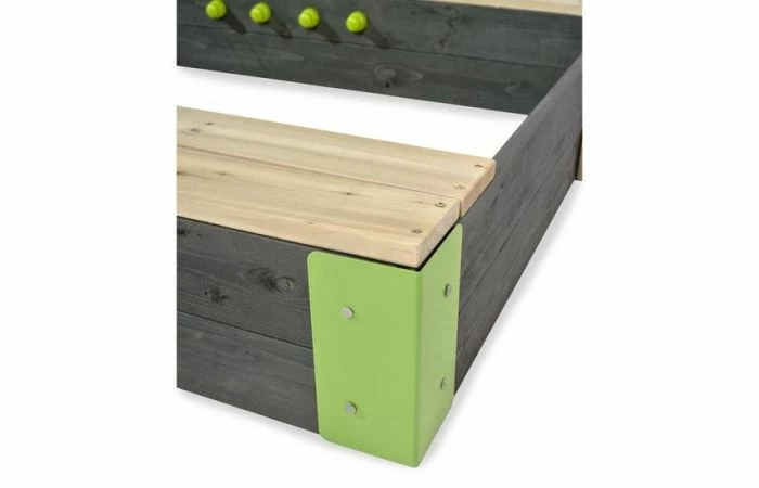De Aksent houten zandbakken van EXIT Toys zijn eenvoudig te monteren en super stevig. De voorgeboorde planken worden in de hoeken bevestigd aan metalen koppelstukken, waardoor de zandbak stabiel staat. De hoeken hebben een opvallend groene kleur en dit in combinatie met het grijskleurige hout geeft de zandbakken een moderne uitstraling.