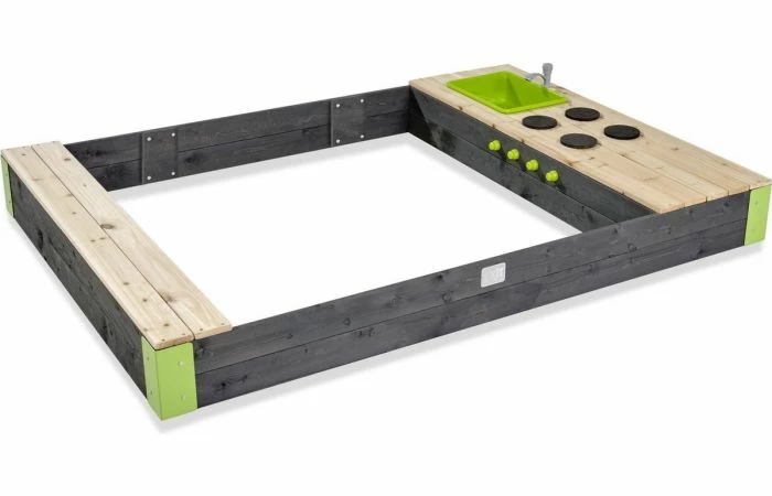 De EXIT Aksent houten zandbak is een grote rechthoekige zandbak. De zandbak is met een bankje, opbergruimte en keuken met keukenaccessoires luxe uitgerust en bezorgt kinderen gegarandeerd veel speelplezier. Bak heerlijke zandtaarten en moddercupcakes en beleef de mooiste avonturen in eigen tuin met deze Aksent houten zandbak van EXIT Toys.