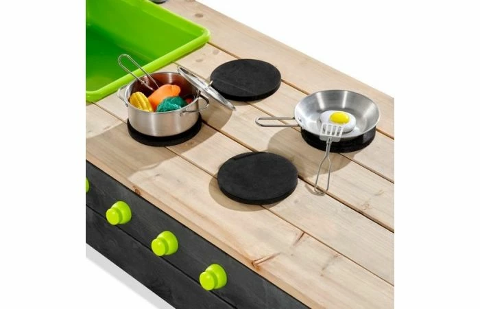 Het keukenblad heeft een fornuis met draaiknoppen en een wasbak met écht werkende kraan. De kraan functioneert wanneer je de tuinslang erop aansluit en dankzij de uitneembare wasbak is het kraanwater eenvoudig uit de wasbak te verwijderen. Onder het keukenblad zit een grote opbergruimte waar je al het speelgoed, zoals de pannen, kwijt kunt als de kinderen zijn uitgespeeld.