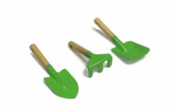 Het gereedschap is gemaakt van metaal met houten handvatten.