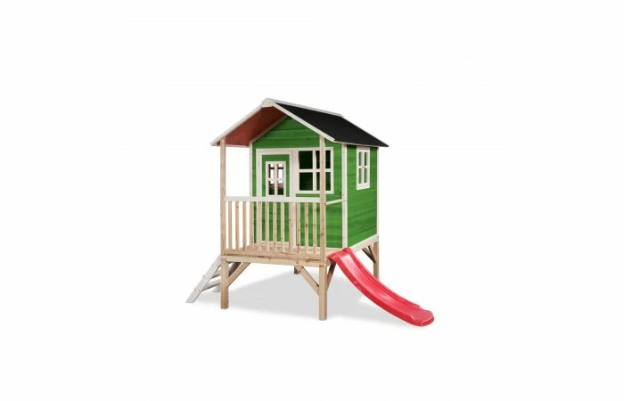 In het EXIT Loft 300 houten speelhuis hoeven de kinderen zich geen dag te vervelen. Dit houten speelhuisje staat op poten en heeft een trapje en een glijbaan die zowel links als rechts aan het speelhuis kunnen worden bevestigd. De speelhuisjes zijn eenvoudig in elkaar te zetten vanwege de vooraf gemonteerde onderdelen. Typerend voor het EXIT Loft 300 houten speelhuis is het strakke Scandinavische design met mooie witte kozijnen. Dit speelhuisje met leuke glijbaan zal zeker niet misstaan in de tuin!