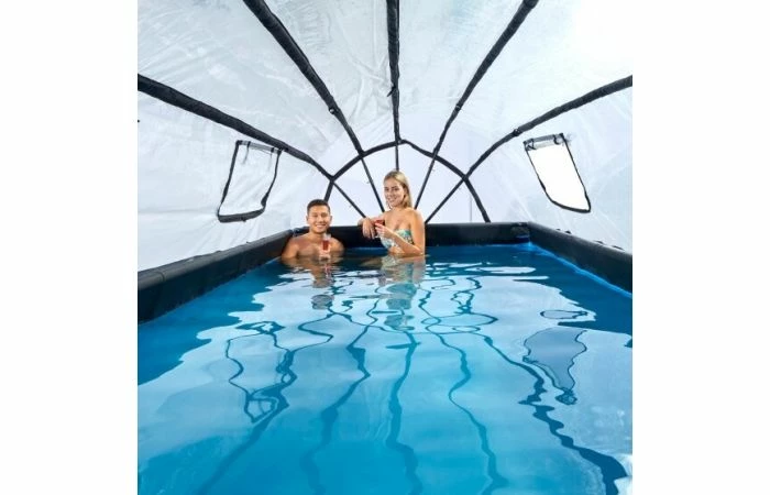 Met de EXIT overkapping voor zwembaden ben je niet langer afhankelijk van de weersvoorspellingen. De overkapping zorgt ervoor dat er geen vuil meer in het water kan komen en is tegelijkertijd een duurzame oplossing voor het verwarmen van je water, want de warmte van de zon wordt onder de kap vastgehouden. De overkapping is transparant en zeer eenvoudig te openen door geïntegreerde gasdrukveren. Ook heeft de overkapping vier opvouwbare ramen. Kortom: in weer en wind genieten van je zwembad.