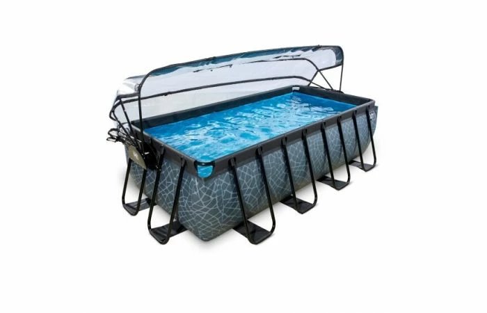 Het EXIT zwembad 400 x 200 x 100 cm is een rechthoekig grijskleurig frame zwembad met overkapping. Het zwembad is standaard voorzien van een zandfilterpomp, warmtepomp en een zwembadtrap, waarmee je veilig het zwembad in en uit kunt stappen. Met het frame zwembad van EXIT Toys beleef je gegarandeerd de leukste wateravonturen in je eigen tuin!