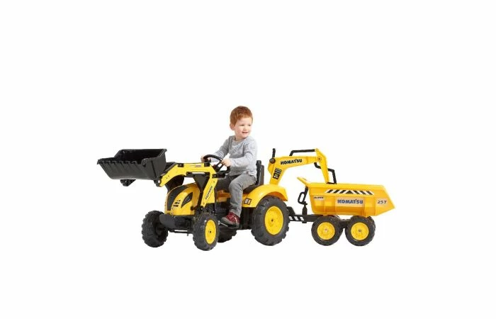 Deze Falk Farm gele traptractor heeft een totale lengte van 203 cm en wordt geleverd inclusief aanhanger. Het is een mooie traptractor van een robuuste kwaliteit, heeft kunststof wielen die zeer slijtvast zijn en het stuur bevat een toeter met geluidsfunctie. De tractor heeft naast een aanhanger aan de achterkant ook nog een shovel aan de voorzijde. De shovel kan door middel van de beweegbare laadarm in verschillende standen worden gezet. Ook zit er aan de achterzijde een graafarm, die handmatig te bedienen is. De aanhanger is makkelijk te koppelen en te ontkoppelen: zo kan er van alles vervoerd worden. Het zitje kan 360 graden draaien. Maximaal draaggewicht: 50 kg. Wordt geleverd in doos met poster. Geschikt voor kinderen vanaf 3 jaar.