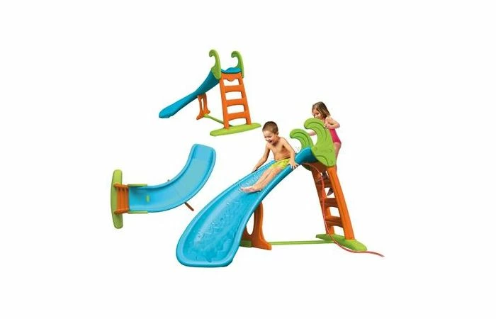 Glijbaan van Feber met fantastische bocht. Voorzien van een wateraansluiting en met een zeer stabiele constructie. Het geheel is dubbelwandig uitgevoerd voor jarenlang speelplezier.