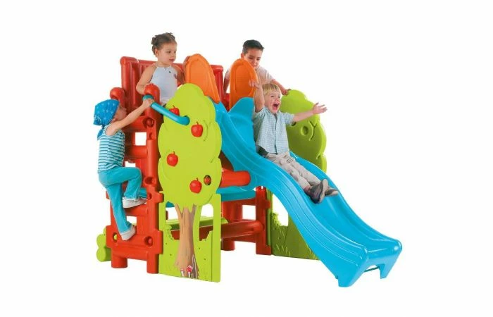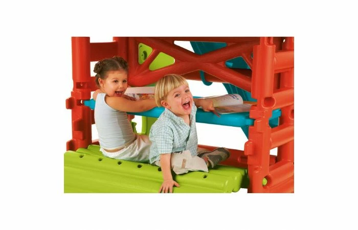 Aan het Wood House van Feber zitten ladders aan twee kanten om op het platform te klimmen en daarna van de aparte slalom glijbaan te glijden. Met een kantelbare bank om aan de tafel te spelen of om op te zitten. Het blad kan worden omgekeerd en als zandspeelbak gebruikt worden. Gereedschap is niet nodig.