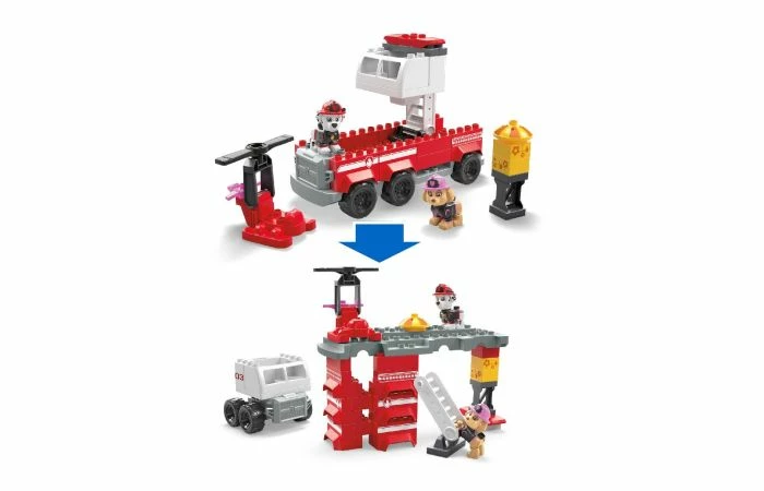 Kleine bouwers kunnen op een reddingsmissie gaan met Marshalls Ultieme brandweerwagen en 2 beweegbare figuren van Marshall en Skye, net als in de serie PAW Patrol. Kinderen kunnen de brandweerwagen in elkaar zetten met een werkende ladder en een voorste cabine die verplaatst kan worden. Hierna kunnen ze de watertoren bouwen, de kraan opendraaien en Marshall en Skye in hun voertuigen plaatsen zodat ze de wereld kunnen redden. Wanneer de missie is volbracht, kunnen kinderen de brandweerwagen verbouwen en er een reddingsstation van maken, met een garage waar een klein voertuig in past en een helipad voor Skye’s helikopter. 37-delig. Wordt geleverd in full-colour box. Geschikt voor kinderen vanaf 3 jaar.