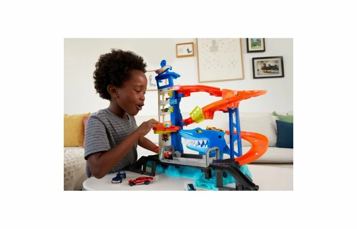 Rij door de Hot Wheels City parkeergarage, maar pas op voor de gevaarlijke haai die nietsvermoedende voertuigen aanvalt en verslindt! De speelset heeft drie activatiepunten die de haai willekeurig activeren om door het circuit te breken en de auto op te peuzelen. Haal de finish om de haai op te sluiten in de kooi, waarna de gevangen auto’s worden vrijgelaten. Inclusief een Hot Wheels voertuig, maar er zijn parkeerplekken genoeg voor meer auto’s. (Extra voertuigen zijn apart verkrijgbaar.) Koppel de speelset aan andere Hot Wheels sets en baandelen voor een unieke stad. Kleuren en versieringen kunnen afwijken. Geschikt voor kinderen vanaf 4 jaar.