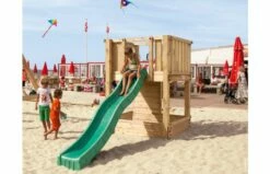 Met een open dak, 150 cm hoog speeldek, klimmuur met vier professionele klimstenen en 3 meter lange glijbaan in het groen polyethyleen of roestvrij staal.