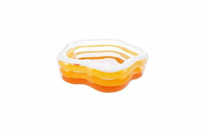 Intex opblaasbaar zwembad in vijfzijdige vorm met doorzichtige, oranje-witte zijwanden. Afmetingen: 185 x 180 x 53 cm. Vervaardigd van stevig vinyl. Met extra zachte, opblaasbare ondergrond.