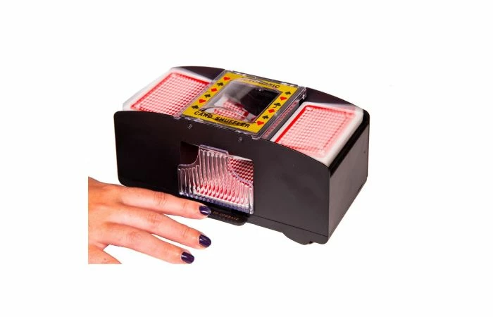 Automatische kaartenschudmachine van Clown Games. Dankzij dit handige apparaatje is schudden met de hand verleden tijd. Dit scheelt moeite, maar voorkomt ook discussie over of de kaarten wel goed geschud zijn! Leg de kaarten op beide zijden van het apparaat, druk op de knop en laat de machine z’n gang gaan. De geschudde kaarten komen onderin het bakje te liggen.