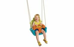 Het zitje groeit met het kind mee van babyzitje tot gewoon schommelzitje. Meer nog, de rugsteun kan tussen twee posities versteld worden. Er is een veiligheidsgordel met gesp die veilig dichtgeklikt kan worden.