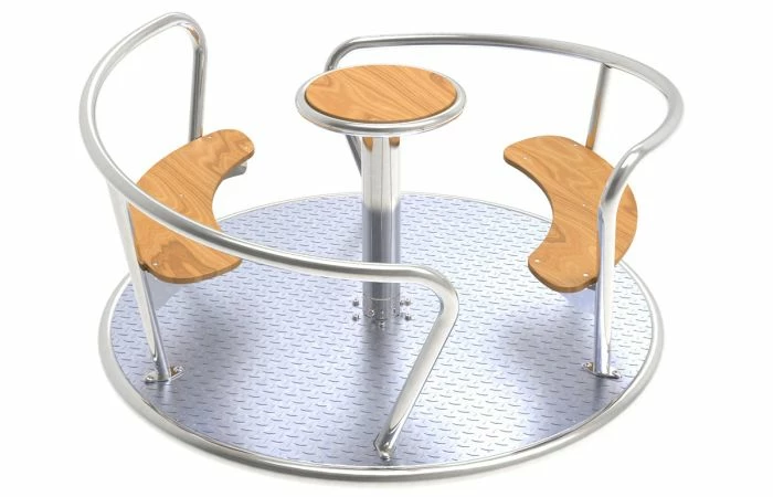 Het draaimechanisme is tevens voorzien van hoogkwalitatieve en onderhoudsvrije rollagers. Het centrale handwiel laat de kinderen toe om al zittend de carrousel zelf te laten draaien op een veilige manier.
