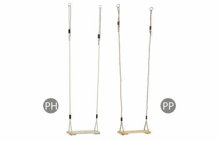 PP-touw: Vervaardigd uit continue polypropyleenvezels. Dit touw heeft een gladde textuur, en zeer goede glijeigenschappen. De standaard kleur is beige. PH-touw: Vervaardigd uit korte gespannen kunststofvezels, is weerbestendig, esthetisch en handvriendelijk. Ongetwijfeld de beste touwsoort voor alle schommels. De standaard kleur is beige.