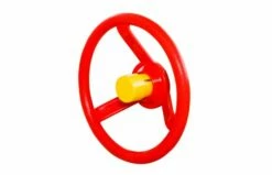 Het stuurwiel in de kleurencombinatie rood/geel heeft een toeter die bij het indrukken het echte geluid van een autotoeter maakt. Er zijn houtschroeven met hexagonale kop, sluitring en afdekdop inbegrepen.