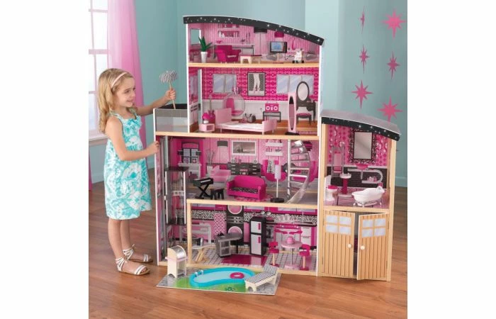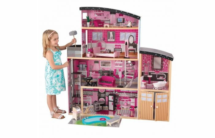 Bereid je voor op het meest sprookjesachtige poppenhuis van de buurt!Ons schitterende Kidkraft Sparkle Mansion poppenhuis zit vol kleurrijke versieringen en leuke details waar meisjes dol op zijn. Van het speciale dak met gewelfde daklijn tot de houten artikelen voor in de achtertuin, dit poppenhuis is echt uniek in zijn soort.