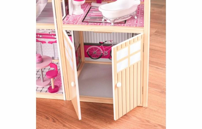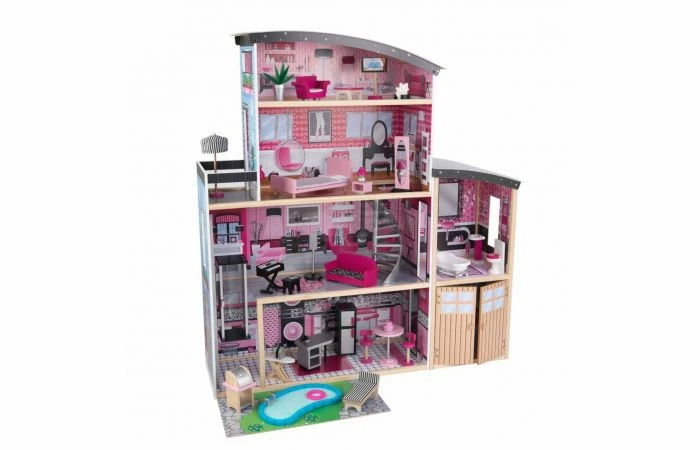 Maar liefs 30 poppenhuismeubelen met details De poppen kunnen met de glijlift van de eerste naar de tweede verdieping Losse achtertuin met zwembad en barbecue Gegoten wenteltrap Groot genoeg dat meerdere kinderen er tegelijkertijd mee kunnen spelen.