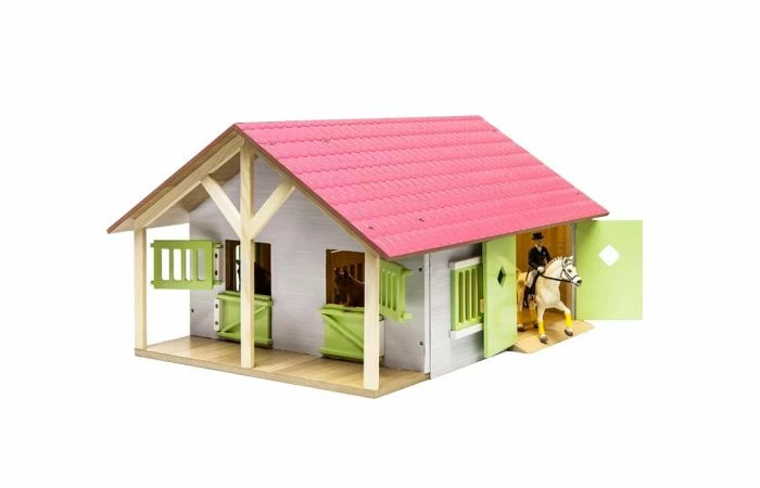 De stal is voorzien van 2 boxen en een berging voor hooi en stro. Dankzij de scharnieren in het dak kan er gemakkelijk vanaf de bovenkant bij de paardenboxen komen.