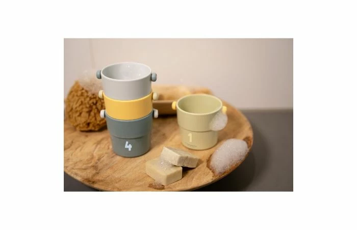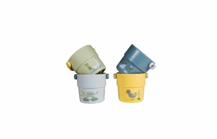 Stapelen, vullen, gieten en SPLASH! Je kleintje zal extra genieten tijdens het badderen met deze set van 4 badbekers. Ze zijn er in 4 kleuren en zijn versierd met illustraties Little Goose en zijn vrienden. De maat is precies goed voor kleine handjes en spelen met de kleine emmertjes helpt bij de ontwikkeling van motorische vaardigheden. Stapel ze op elkaar om een grote toren te bouwen en omver te werpen. Of vul ze met water en zie er verschillende vormen uitstromen. Spetters en plezier gegarandeerd! Geschikt voor kinderen vanaf 4 maanden.