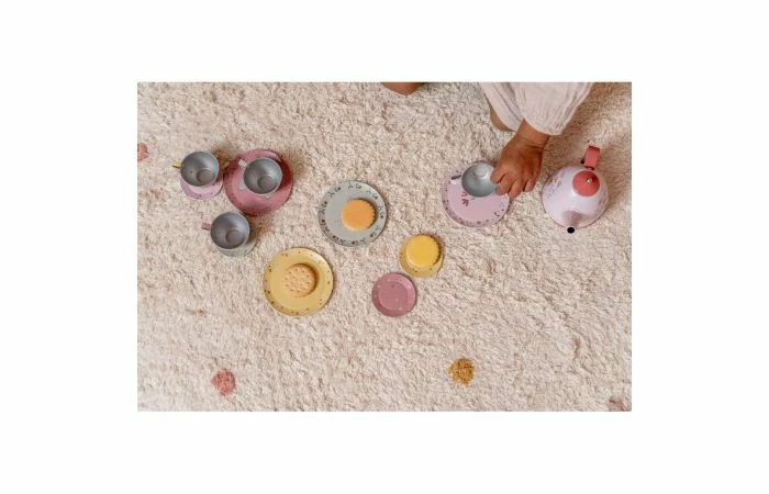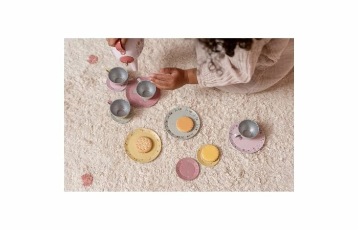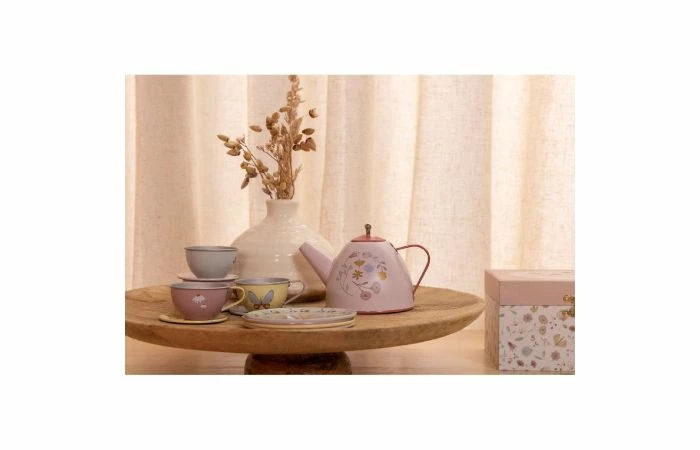 Zullen we samen theedrinken? Met dit schattige tinnen theeservies speelt je kind een geweldig rollenspel. Dit theesetje versierd met bloemen en vlinders prikkelt de fantasie van kinderen en stimuleert de fijne motoriek. De set bestaat uit vier kleine theekopjes, vier schoteltjes, vier gebaksbordjes en een theepot met deksel. Let op: berg het product na gebruik droog op. Geschikt voor kinderen vanaf 36 maanden.