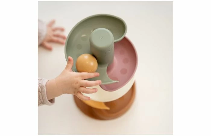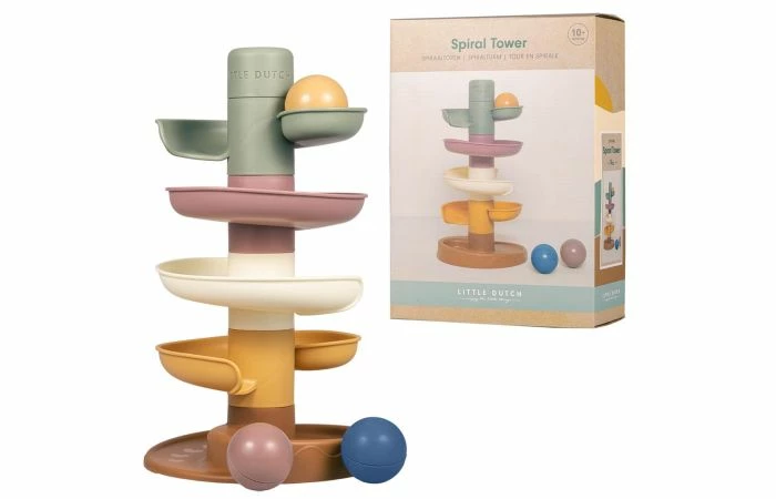 Laat de bal maar rollen! De spiraaltoren van Little Dutch zorgt voor eindeloos veel speelplezier. Deze kleurrijke set bestaat uit 5 herkenbare vintage gekleurde delen die jouw kleintje gemakkelijk op elkaar stapelt. Laat de ballen één voor één op de bovenste laag vallen en kijk hoe ze achter elkaar naar beneden rollen en slingeren. De spiraaltoren draagt bij aan de ontwikkeling van de hand-oog coördinatie en leert kleintjes over oorzaak en gevolg, waarmee het zowel leuk als leerzaam spelen is. Bij de spiraaltoren zitten standaard 3 lichte en gemakkelijk vast te pakken ballen in verschillende kleuren die bij beweging een geluidje maken. Dit speelgoed is uitgevoerd in de super trendy Little Dutch retro kleuren. De afmeting is: 18 x 18 x 30 cm. Geschikt voor kinderen vanaf 18 maanden.