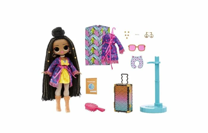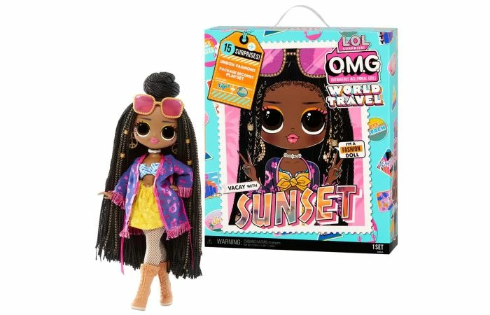 LOL Surprise OMG World Travel-modepop Sunset. Pak 15 verrassingen uit, inclusief mode en accessoires met een reisthema, zoals bagage die echt open kan, een nekkussen, zonnebril en paspoort! Sunset heeft een heel mooi gezichtje, prachtig gestyled haar en beweegbare ledematen voor heel veel houdingen. Bovendien is ze de grote zus van het populaire LOL Surprise-personage Foxy. Trek Sunset haar übercoole mode aan en vul aan met de fantastische accessoires. Tip voor pro’s: de handen zijn verwijderbaar, zodat je de pop makkelijk kunt aankleden. De verpakking van elke LOL Surprise OMG World Travel-pop is een herbruikbare speelset. Met Sunset krijg je 1 LOL Surprise OMG-modepop, trendy outfit, mode-accessoires, oorbellen, schoenen, koffer, zonnebril, nekkussen, halsketting, paspoort, haarborstel, kledinghoes, kledinghanger, poppenstandaard en herbruikbare verpakkingsspeelset. Verzamel alle 3 LOL Surprise OMG World Travel-modepoppen! Geschikt voor kinderen vanaf 4 jaar.