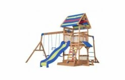 Backyard Discovery’s speelset Northbrook heeft een groot terras en een kleurrijke luifel. Het bovenste fort geeft uw kinderen het gevoel dat ze onder een grote parasol zitten of op volle zee zeilen op zoek naar piraten. Stuurwiel en telescoop inbegrepen op het platform. De ladder en “apenstangen” bieden veilige mogelijkheden voor een leuke klim naar boven, en de glijbaan van 244 cm zorgt voor een snelle, golvende afdaling naar de bodem. Probeer kastelen te bouwen en schrijf je namen in de zandbak hieronder. Ga dan naar de felgekleurde luifel en de snackbar om af te koelen met een koud drankje. De structuur is van tropisch cederhout. Dit hout is van nature bestand tegen insecten, rotbestendig en valt niet uiteen. Om de veiligheid van uw kinderen te garanderen, is ons hout volledig vrij van chemicaliën. De verf die we gebruiken is op waterbasis. Montage door 2 volwassenen aanbevolen. De planken zijn geboord, gebeitst en klaar om gemonteerd te worden.