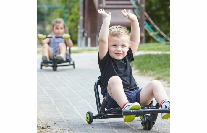 De Bikez Racer is geen gewone trapskelter. Je komt vooruit door je voeten afwisselend heen en weer te bewegen. Zo maak je snelheid en je handen gebruik je ook om te sturen. Het vraagt een en ander van je motoriek en van de oog-hand-coördinatie en dat is een extra uitdaging. Deze Olifu Bikez Racer is echt geweldig.